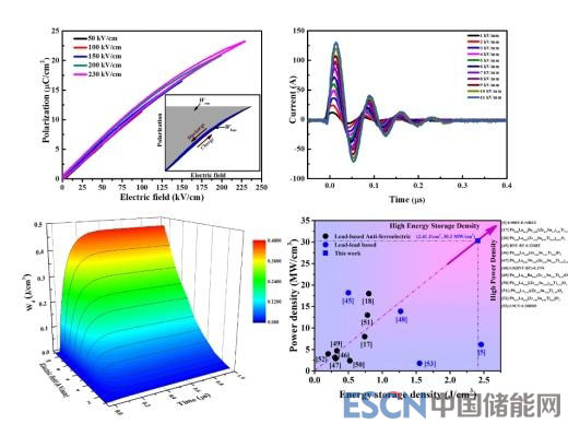 小型化和輕量化一直是儲能電容器的重要發(fā)展趨勢。為此,該團(tuán)隊(duì)聚焦尚無文獻(xiàn)報(bào)道的鈮酸鈉(NaNbO3)體系。NaNbO3的體積密度僅為4.55g/cm3,相比鐵酸鉍(8.37g/cm3)、鈦酸鋇(6.02g/cm3)、鈦酸鉍鈉 (5.977g/cm3)等其它無鉛介質(zhì)材料體系,它在儲能電容器的輕量化方面具有明顯的優(yōu)勢。然而,電場誘導(dǎo)的亞穩(wěn)態(tài)鐵電性和堿金屬鈉元素?fù)]發(fā)導(dǎo)致的耐電強(qiáng)度低制約了NaNbO3在儲能方面的應(yīng)用。該團(tuán)隊(duì)先后采用順電體調(diào)控和A位空位策略來增強(qiáng)NaNbO3的儲能特性,構(gòu)筑了兩種新型的NaNbO3基儲能介質(zhì)陶瓷材料:NaNbO3-SrTiO3和Na1-3xBixNbO3。這兩種NaNbO3基儲能介質(zhì)陶瓷材料均表現(xiàn)出了優(yōu)異的儲能特性、充放電特性及穩(wěn)定性,其中Na1-3xBixNbO3的綜合儲能特性(儲能密度:4.03J/cm3、儲能效率:85.4%、功率密度:62.5 MW/cm3)為目前文獻(xiàn)報(bào)道的最優(yōu)值。該工作為NaNbO3材料開辟了新的應(yīng)用方向,同時(shí)也為設(shè)計(jì)高儲能無鉛介質(zhì)材料提供了新的方法和思路。相關(guān)研究成果發(fā)表在Journal of Materials Chemistry A (J. Mater. Chem. A, 2018,6, 17896-17904)和ACS Sustainable Chemistry & Engineering (ACS Sustainable Chem. Eng. 2018, 6, 10, 12755-12765)上。