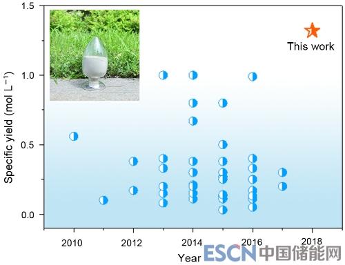 圖3 水熱/溶劑熱合成方法制備LiFePO4單位體積產(chǎn)率的比較。插圖為本工作中合成的LiFePO4的光學(xué)照片。