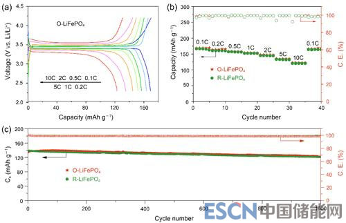 圖4 原始的O-LiFePO4/C和回收的R-LiFePO4/C的電化學(xué)性能曲線。(a)O-LiFePO4/C在0.1–10C不同倍率范圍內(nèi)的典型充放電曲線。(b)倍率性能。(c)O-LiFePO4/C和R-LiFePO4/C在3C倍率下的長循環(huán)穩(wěn)定性。3C對應(yīng)的充電或放電時間為20分鐘。