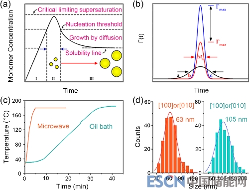 圖1 經(jīng)典的LaMer形核和生長機制以及實驗結(jié)果。(a)經(jīng)典LaMer機理,顆粒在溶液中成核和生長過程中單體濃度變化的示意圖。(b)三個具有高斯分布的形核函數(shù)。形核函數(shù)的寬度()對應(yīng)形核時間窗口。(c)微波加熱和油浴加熱兩種加熱模式下的原位溫度與時間曲線。(d)由兩種不同的加熱模式制備的LiFePO4沿[100]或[010]方向的尺寸統(tǒng)計。微波加熱的尺寸為63nm,而在常規(guī)油浴加熱的情況下,尺寸為105nm。