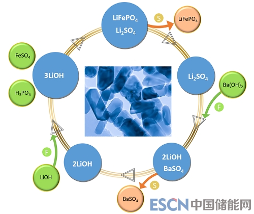 圖2 LiFePO4納米晶水熱合成路線及鋰回收示意圖。以LiOH、FeSO4和H3PO4為原料制備納米LiFePO4。用Ba(OH)2做沉淀劑與濾液反應(yīng),隨后進行固液分離,回收LiOH。插圖為LiFePO4的TEM照片。