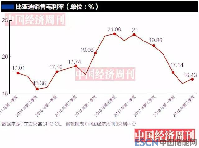 中國儲能網(wǎng)訊:近日,國內(nèi)電動汽車龍頭比亞迪(002594.SZ)交出2018年三季度業(yè)績報告,扣除政府補助和賣資產(chǎn)等非經(jīng)常性損益后,前三季度歸屬上市公司股東凈利潤虧損1.65億元,同比下滑108.38%,創(chuàng)出自2015年以來新低;公司前三季度銷售毛利率只有16.43%,低于2015—2017年同期17.74%21.08%的水平。