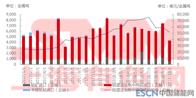中國儲能網(wǎng)訊:據(jù)統(tǒng)計2018年10月中國鈷原料進(jìn)口總量4,383金屬噸,環(huán)比下滑41%,同比下滑17%。進(jìn)口原料中,鈷礦進(jìn)口566.7金屬噸(按8%品位折算),環(huán)比下滑51%,同比上漲48%;鈷濕法冶煉中間品進(jìn)口3,766金屬噸(按27%品位折算),環(huán)比下跌40%,同比下跌20%。價格方面,10月鈷濕法冶煉中間品進(jìn)口進(jìn)口均價隨外媒報價繼續(xù)下滑,環(huán)比下跌13 %。