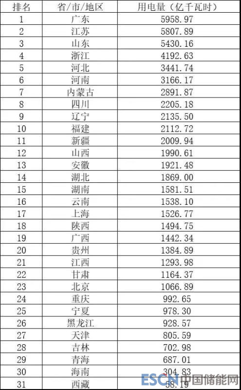 2017年各省全社會(huì)用電量排行