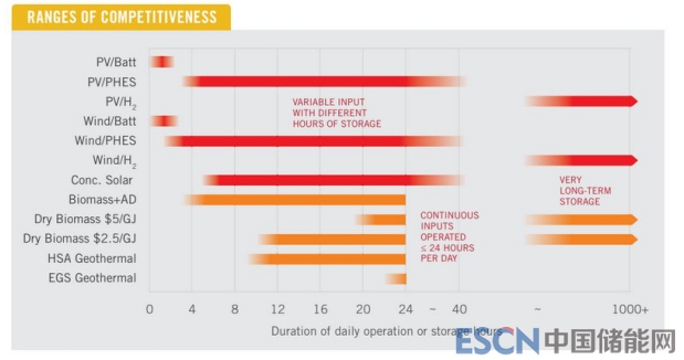 該報告證實了許多人可能認為顯而易見的事實:與太陽能發(fā)電或風力發(fā)電相結合的電池儲能系統(tǒng)是短時間儲能框架(以及許多電網(wǎng)服務)成本最低的選擇,而抽水蓄能電站是大約6-24小時儲能成本最低的選擇,可以與太陽能熱儲能技術進行競爭。而對于長期儲能來說,采用氫氣儲能和生物質儲能是成本最低的選擇。