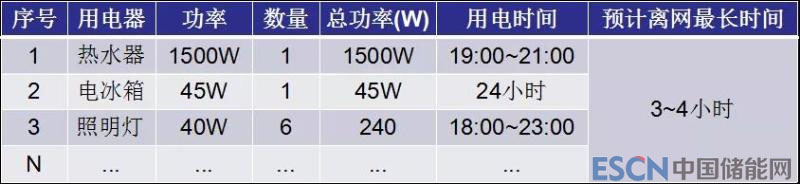 這個(gè)案例中的重要負(fù)載很單一,設(shè)計(jì)過程相對簡單。如果系統(tǒng)中有其他重要負(fù)載,需要全部列出(如下例)然后根據(jù)全天最長連續(xù)停電時(shí)長內(nèi)最大的用電負(fù)載功率和用電量,最后確定需要的電池容量。
