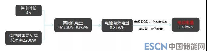其中離網(wǎng)時(shí)的用電總功率和離網(wǎng)預(yù)計(jì)時(shí)間是最關(guān)鍵的參數(shù)。以停電預(yù)計(jì)的最長時(shí)間4小時(shí)來計(jì)算,其設(shè)計(jì)思路可參考: