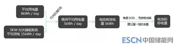 最理想狀態(tài)是,光伏+儲能系統(tǒng)能夠完全覆蓋家庭用電。但是這種情況很難實(shí)現(xiàn)。所以我們綜合考慮投入成本和用電情況,可以選擇根據(jù)家庭平均日用電量(kWh)來選擇電池的容量(默認(rèn)光伏系統(tǒng)能量充足)。設(shè)計(jì)邏輯如下 :