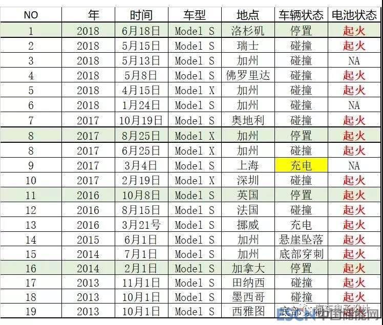 中國(guó)儲(chǔ)能網(wǎng)訊:從后兩年開(kāi)始,我們將直接面對(duì)特斯拉在家門(mén)口的競(jìng)爭(zhēng),可行的策略,是電池成本要和它相當(dāng)、車(chē)輛里程要與之相當(dāng)、能量密度和安全性要與之相當(dāng),反正不能比它差。在所有的特斯拉已知的事故里面,電池起火是大概率的事情,如下表所示,這里面有幾個(gè)地方,值得往下進(jìn)一步去挖掘。