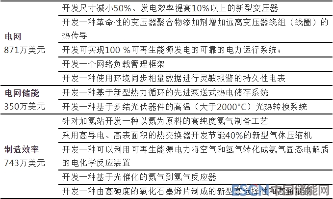 中國儲能網(wǎng)訊:美國能源部先進能源研究計劃署(ARPA-E)將資助9800萬美元用于遴選的40項變革性能源技術開發(fā)項目,其中包含350萬美元資助電網(wǎng)儲能項目,包含:開發(fā)一種基于新型熱力循環(huán)的先進泵送式熱電儲存系統(tǒng)、開發(fā)一種基于多結光伏器件的高溫(大于2000°C)光熱轉換系統(tǒng)。此外還有電動汽車、燃料電池等項目。詳見下文表單。
