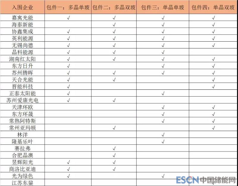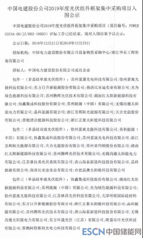 中國(guó)儲(chǔ)能網(wǎng)訊:今日,中電建公示了2019年度1GW光伏組件框架集中采購(gòu)項(xiàng)目的入圍結(jié)果,四個(gè)標(biāo)段共計(jì)25家企業(yè)入圍,詳情見(jiàn)下表。