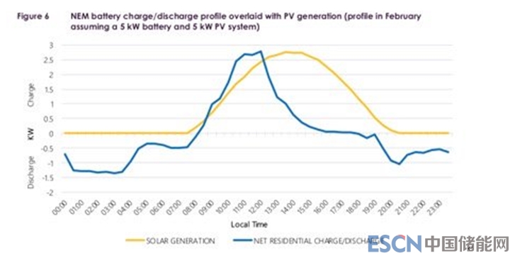 (2)澳大利亞能源市場運營機構(gòu)(AEMO)在家庭電池儲能系統(tǒng)使用電池方面進行假設(shè),儲能系統(tǒng)會在傍晚的高峰期放電,而在早上需求低谷期放電很少(見圖6)。如果這是正確的做法,并且在更大規(guī)模上發(fā)生,這將減少電網(wǎng)側(cè)儲能系統(tǒng)在早上的電力需求,并使其電力斜坡更陡峭。