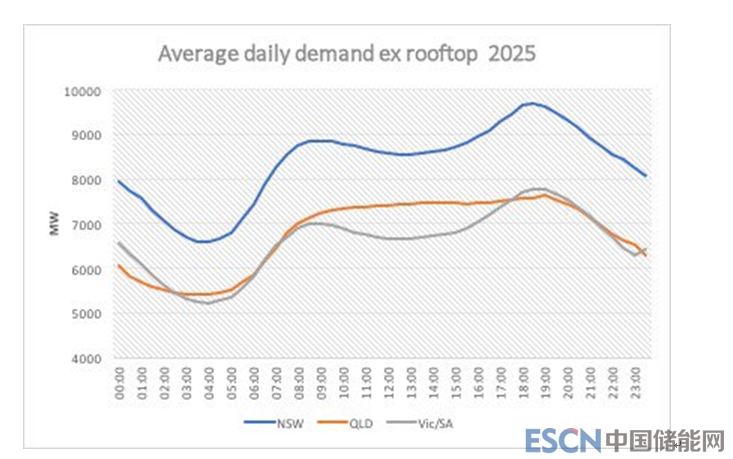 在這張圖表中,QLD需求曲線在正午的時候是平的,而為住宅太陽能采用的電池儲能充電可能會增加正午的電力需求。同樣值得關(guān)注的是,在澳大利亞,它是最陡峭的早晨高峰期。
