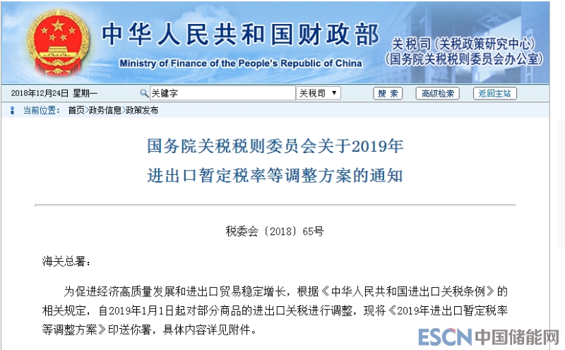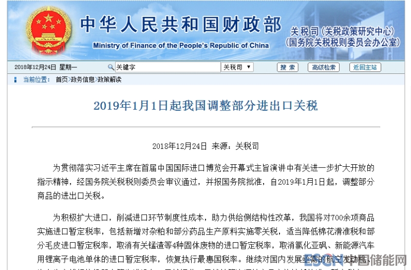 中國儲能網(wǎng)訊:12月24日,國家財(cái)政部發(fā)布通知,自2019年1月1日起,調(diào)整部分商品的進(jìn)出口關(guān)稅。取消有新能源汽車用鋰離子電池單體的進(jìn)口暫定稅率,恢復(fù)執(zhí)行最惠國稅率。12月22日《2019年進(jìn)出口暫定稅率等調(diào)整方案》中鋰、鈷酸鋰等原材料2019年暫定稅率均有不同程度下調(diào)。