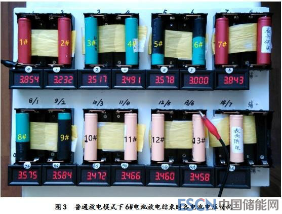 而在均衡放電實驗中,臨近放電結(jié)束前,電壓一直處于相對最低的卻是11#電池,而不是6#電池,同樣也不是2#電池,主要原因就是均衡器的介入自動改變了每塊電池的實際放電電流,明顯降低了2#和6#電池的實際放電電流,在常規(guī)放電實驗中,1#和7#電池的電壓一直處于最高狀態(tài),直至放電結(jié)束,顯示出這兩塊電池的容量最大。