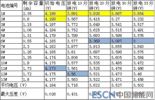 從放電測量數(shù)據(jù)可以看出,放電至33分鐘時,6#電池到達放電截止電壓,停止放電,此時,2#電池的電量也即將放完,但其他11塊電池仍具有較多的電量沒有釋放出來,放電結(jié)束時的電壓就說明了一切,特別是1#和7#電池還剩余非常多的電量沒有釋放,無法利用,這種情況特別像安裝了具有單體電池放電保護的BMS電池管理系統(tǒng)的動力電池組。