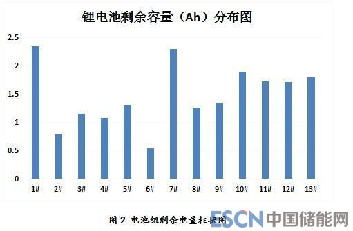 在充滿電后靜止2小時進行容量檢測的情況下,1A放電檢測實際剩余容量只有550mAh至2350mAh之間,見表1剩余容量欄,通過檢測容量可以看出,容量差異非常大,最大差值達1.8Ah,實驗電池共計13塊,所有電池剩余電量柱狀圖如圖2 所示。