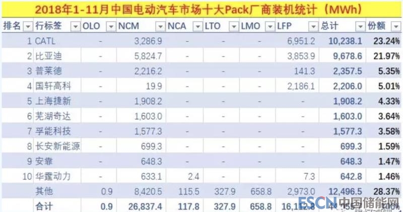 中國(guó)儲(chǔ)能網(wǎng)訊:真鋰研究的統(tǒng)計(jì)數(shù)據(jù)顯示,2018年1-11月中國(guó)電動(dòng)汽車(chē)市場(chǎng)共實(shí)現(xiàn)鋰離子電池裝機(jī)44.1GWh,之前我們每月發(fā)布的都是電池芯(Cell)廠(chǎng)商的情況,這里我們來(lái)看看電池包(Pack)廠(chǎng)商的情況。