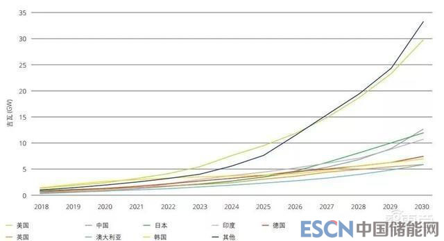 ▲2018-2030年全球各國(guó)累計(jì)儲(chǔ)能部署