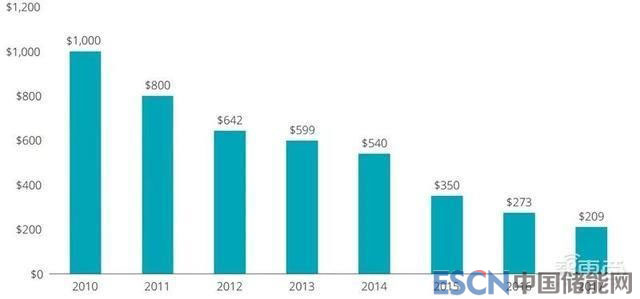 ▲2010年至2017年鋰離子電池價(jià)格下降80% (美元/kWh)