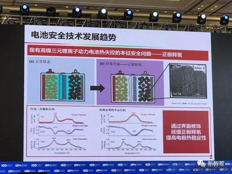 目前世界范圍內(nèi)的發(fā)展關(guān)鍵趨勢(shì)是鋰離子動(dòng)力電池高比能量化,因此不能因?yàn)榘踩珕栴}就不發(fā)展高比能量電池,關(guān)鍵是要把握高比能量與安全性之間的平衡點(diǎn)。例如,高鎳三元鋰離子動(dòng)力電池的本征安全機(jī)理是正極釋放氧,因此可以通過界面修飾延緩正極釋氧,提高穩(wěn)定性。此外,開發(fā)新一代固態(tài)電解質(zhì),才能從根本上解決電解液燃燒問題。