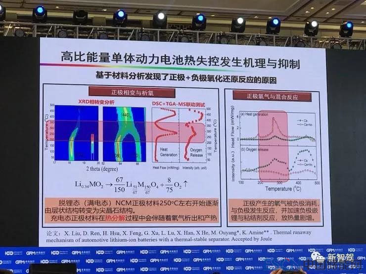 高比能量單體動(dòng)力電池?zé)崾Э刂饕赥2-T3階段,發(fā)生機(jī)理不清,通常認(rèn)為該現(xiàn)象是內(nèi)短路造成的。但經(jīng)研究發(fā)現(xiàn),即使沒有內(nèi)短路,熱失控還會(huì)發(fā)生。原因是高比能量電池的耐高溫新型隔膜到200度以上無變化,電解液基本蒸發(fā)完全,而在230-250度時(shí),正極材料相變放出的氧與負(fù)極反應(yīng)產(chǎn)生了放熱高峰。