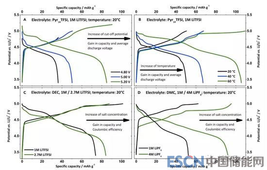 3)電解液作為活性物質(zhì),其陰離子的選擇,溶劑的選擇和添加劑的選擇都會對電池的工作電壓、容量等產(chǎn)生顯著的影響。
