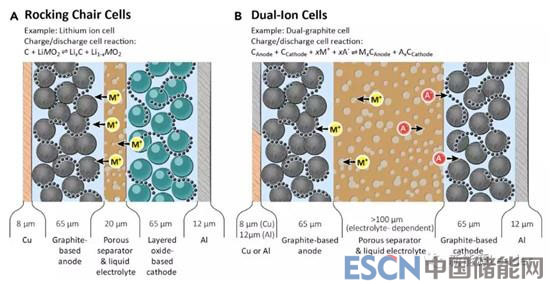 雙離子電池之所以叫雙離子電池,是因?yàn)樵陔p離子電池體系中參與電化學(xué)反應(yīng)的并不是單一離子,我們知道在鋰離子電池中在正負(fù)極之間穿梭的只有Li+一種離子,電解液中的陰離子(如PF6-)并不參與反應(yīng)。而在雙離子電池中則不然,不但陽離子能夠發(fā)生嵌入反應(yīng),電解液中的陰離子也能夠發(fā)生嵌入反應(yīng)。