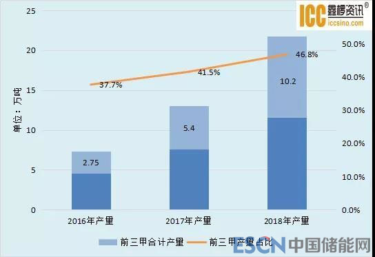 2018年三元前驅(qū)體行業(yè)集中度仍在繼續(xù)提高,前三甲企業(yè)總產(chǎn)量超過10萬噸,占據(jù)15家其企業(yè)總產(chǎn)量的46.8%,較去年提高了5.3%。