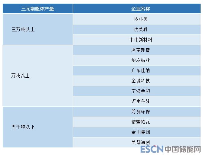 2018年,前驅(qū)體產(chǎn)量前三甲依舊是格林美、優(yōu)美科以及中偉新材料,這三家企業(yè)的前驅(qū)體年產(chǎn)量均躍至3萬噸以上。2018年國內(nèi)共有9家三元前驅(qū)體企業(yè)的年產(chǎn)量超過了1萬噸,較2017年增加5家。