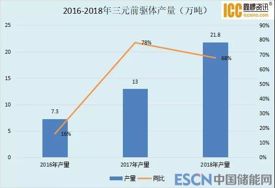 中國儲能網(wǎng)訊:隨著三元鋰電池需求量的增長,2018年國內(nèi)三元前驅(qū)體行業(yè)迅速擴張。據(jù)鑫欏資訊對國內(nèi)16家三元前驅(qū)體企業(yè)產(chǎn)量的統(tǒng)計情況來看,2018年三元前驅(qū)體產(chǎn)量為21.8萬噸,同比去年增長68%。