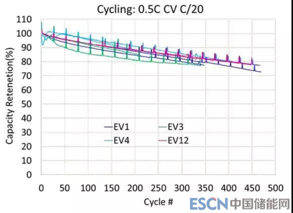 通過(guò)在電解液里添加提高SEI膜穩(wěn)定性的添加劑,提高了電芯的性能和壽命。2017年,篩選了100多種電解液配方,包括不同添加劑、溶劑和鋰鹽。重點(diǎn)改善正極在高SOC和高溫下的產(chǎn)氣。通過(guò)測(cè)試高溫(50℃)下的循環(huán)和存儲(chǔ)性能來(lái)篩選電解液。循環(huán)測(cè)試制度為:CC-CV at C/2 rate with 10% current taper and C/2discharge rate, over the full voltage range (2.85-4.25V)。
