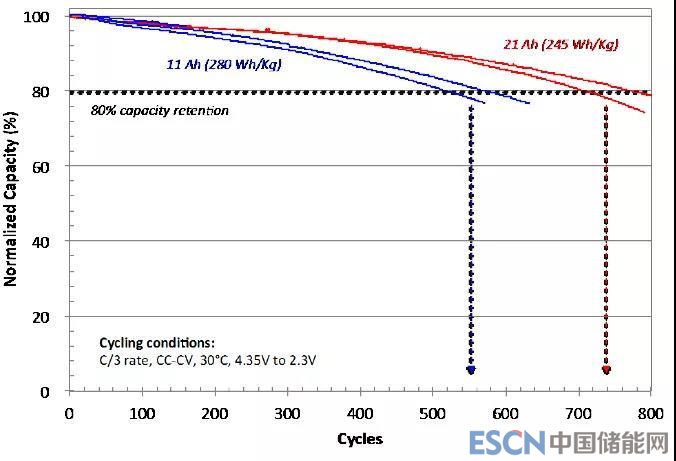 17年主要完成了11Ah軟包電芯(Cell-build 2#)的制備,比能量達(dá)到280Wh/kg,循環(huán)大于500周(C/3rate,CC-CV,30℃,4.35V to 2.3V)。比能量為245Wh/kg 的21Ah軟包電芯(Baseline cell),循環(huán)大于700周(C/3 rate,CC-CV,30℃,4.35V to 2.3V)。18年將會(huì)制備循環(huán)壽命大于1000的300Wh/kg的11Ah軟包電芯(Cell-build 3#),循環(huán)大于1000次的50Ah軟包電芯(Cell-build 4#)。