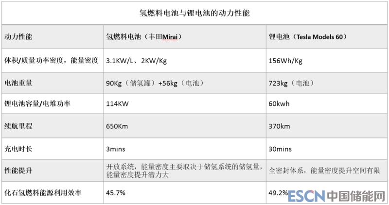 下表為氫燃料電池汽車(chē)代表豐田Mirai和動(dòng)力鋰電池汽車(chē)代表特斯拉的性能對(duì)比。
