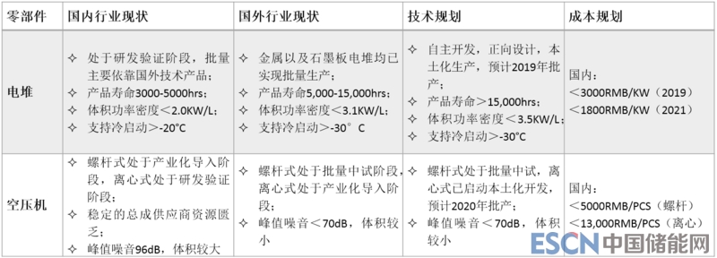 燃料電池系統(tǒng)核心零部件主要有電堆、空壓機(jī)、DC/DC、氫 氣循環(huán)泵、增濕器等,下表介紹了目前國(guó)內(nèi)外燃料電池核心零部件中,電堆與空壓機(jī)的技術(shù)發(fā)展情況。