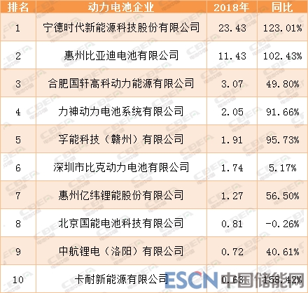 2018年國內(nèi)動力電池裝機量前10家企業(yè)(單位:GWh)