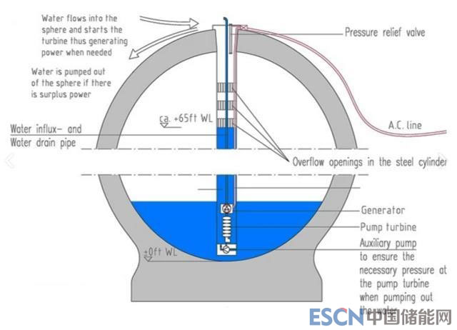 StEnSea項(xiàng)目為安裝在海底,可與海上風(fēng)電場聯(lián)接的大型儲能設(shè)施。其儲能原理類似于常規(guī)抽水儲能電站的物理原理,但其儲能主體為多個(gè)內(nèi)直徑30米的混凝土空心球。這些球會被放在600~800米深的海床上。每個(gè)球里都有一臺水輪發(fā)電機(jī)和一臺水泵。