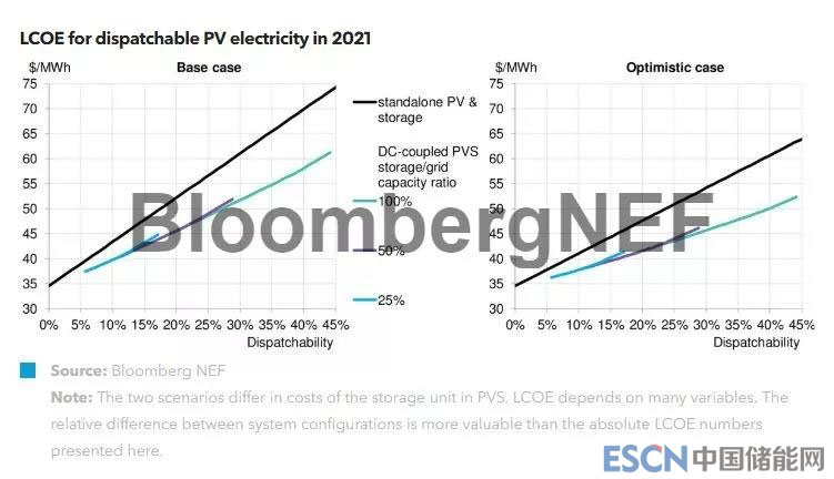 在可調(diào)度性(儲(chǔ)能設(shè)備管理的電量在整個(gè)系統(tǒng)總發(fā)電量中所占的比例)相同的情況下,相較于完全獨(dú)立運(yùn)行的光伏與儲(chǔ)能項(xiàng)目或AC耦合型PVS,DC耦合型PVS能夠更有效地利用光伏與儲(chǔ)能部分間的協(xié)同作用來降低度電成本。預(yù)計(jì)2021年投運(yùn)的很多PVS系統(tǒng)都將儲(chǔ)能單元的功率設(shè)計(jì)為電網(wǎng)接入容量的25%,且儲(chǔ)能時(shí)長為4小時(shí)。對(duì)于日照條件較好的地域,譬如南加州,這樣的設(shè)計(jì)應(yīng)用在優(yōu)化的DC耦合PVS對(duì)應(yīng)約10.5%的可調(diào)度性。按我們對(duì)儲(chǔ)能系統(tǒng)成本下降的保守預(yù)測來計(jì)算,上述的DC耦合PVS對(duì)應(yīng)40美元/MWh的度電成本(LCOE),比可以實(shí)現(xiàn)同樣可調(diào)度性的獨(dú)立運(yùn)行的光儲(chǔ)項(xiàng)目低9%。當(dāng)可調(diào)度性升至40%時(shí),DC耦合PVS的LCOE比獨(dú)立運(yùn)行的光伏儲(chǔ)能項(xiàng)目低17%。