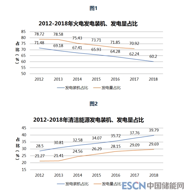 2012年以來,核電、風(fēng)電、太陽能設(shè)備容量年均增速分別達(dá)到23.5%、20.1%和92.7%,清潔能源發(fā)電裝機(jī)占比從2012年的28.50%上升到2018年的39.79%,火電裝機(jī)占比則從71.48%下降至60.20%。與此同時,清潔能源發(fā)電量比重也逐年提高,從2012年的21.27%上升至2018年的29.69%,火電發(fā)電量占比則從78.72%下降至70.92%。