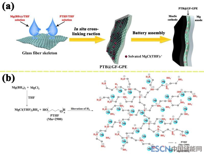 基于以上研究背景,依托中國(guó)科學(xué)院青島生物能源與過(guò)程研究所建設(shè)的青島儲(chǔ)能產(chǎn)業(yè)技術(shù)研究院通過(guò)硼氫化鎂與聚四氫呋喃端羥基的原位交聯(lián)反應(yīng),在玻璃纖維骨架上構(gòu)建了一種能夠可逆地沉積溶解鎂的凝膠聚合物電解質(zhì)體系。該凝膠電解質(zhì)表現(xiàn)出高的鎂離子遷移數(shù)(0.73)和高的室溫離子電導(dǎo)率(4.76×10-4S/cm)。而裝配該凝膠電解質(zhì)體系的Mo6S8/Mg電池不僅能在寬溫區(qū)(-20-60℃)內(nèi)正常工作,而且展現(xiàn)出優(yōu)異的安全性能。這種原位交聯(lián)的方法為鎂電池聚合物電解質(zhì)的進(jìn)一步開(kāi)發(fā)提供了一種十分有應(yīng)用潛力的策略。相關(guān)成果發(fā)表在《先進(jìn)材料》(Advanced Materials)上,論文第一作者為青島能源所博士生杜奧冰。