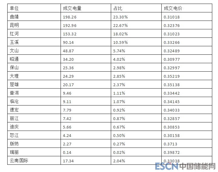 分地區(qū)來看,昆明、曲靖、紅河、玉溪地區(qū)用戶的市場化交易電量達(dá)634.68億千瓦時,占全部市場化交易電量的76.13%,其中曲靖地區(qū)成交198.3億千瓦時,占全部交易電量的 23.78%;昆明地區(qū)成交193億千瓦時,占全部交易電量的23.15%;紅河地區(qū)成交153.3億千瓦時,占全部市場化交易電量的18.39%;玉溪地區(qū)成交90.1億千瓦時,占全部市場化交易電量的10.81%。