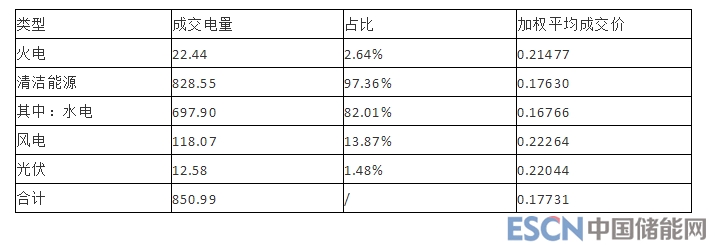 2018 年,市場化電廠在省內(nèi)市場累計(jì)成交電量 850.99 億千瓦時,同比增長 21.03%,以水電為主的清潔能源成交電量 828.55億千瓦時,占總成交電量的 97.36%,平均成交價每千瓦時0.17630元,其中,水電成交電量697.9億千瓦時,占總成交電量的82.01%,平均成交價每千瓦時0.16766元;風(fēng)電成交電量118.07億千瓦時,占總成交電量的13.87%,平均成交價每千瓦時0.22264元;光伏成交電量12.58億千瓦時,占總成交電量的1.48%,平均成交價每千瓦時0.22044元?;痣姵山浑娏?2.44億千瓦時,占總成交電量的2.64%,平均成交價每千瓦時0.21477元。