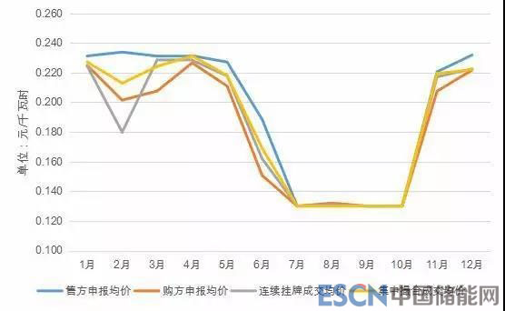 隨著市場規(guī)則的不斷完善和市場主體市場意識的不斷增強(qiáng),2018年,大部分市場主體選擇通過雙邊協(xié)商的方式參與市場,集中撮合交易成交規(guī)模不斷縮減,成交電量占月度市場成交電量的比例較2017年降低 13.14個百分點(diǎn),其中最高占比為2.04%(2月),最低僅占0.04%(10月)。雖然月度集中撮合交易市場占比進(jìn)一步縮減,但是月度集中撮合交易依然發(fā)揮著發(fā)現(xiàn)市場價格信號的作用,主要體現(xiàn)在:一是雙邊交易中,很多市場主體以集中撮合交易平均成交價為“標(biāo)桿”,按照約定的浮動機(jī)制來確定雙邊交易電量的最終成交價;二是連續(xù)掛牌交易中,市場主體通常將參考集中撮合交易平均成交價進(jìn)行報價;三是售電公司的價格保底服務(wù)模式中,通常將用戶成交價低于集中撮合交易平均成交價作為收取交易服務(wù)費(fèi)的前提條件。2018年,月度集中撮合交易平均成交價每千瓦時0.21540元,在枯平期的1至5月價格比較平穩(wěn),維持在每千瓦時0.22元左右,6月份由于開始進(jìn)入雨季,市場普遍預(yù)期電量供給增加,交易平均成交價為每千瓦時0.169元,在主汛期7至10月份均為“地板價”每千瓦時0.13元,11、12月逐步回升至每千瓦時0.22205元。