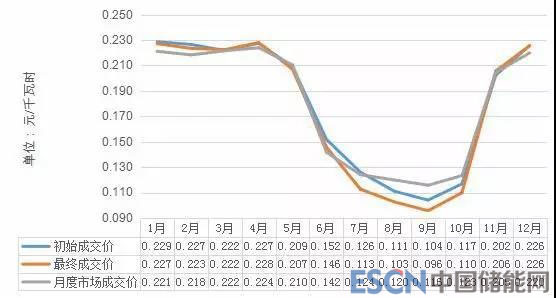 月度雙邊協(xié)商交易與年度雙邊協(xié)商交易類似,在集中市場交易結(jié)束、交割月之前,可以對已簽訂的雙邊合約價格進(jìn)行調(diào)整。通過實(shí)行“基準(zhǔn)價格+浮動機(jī)制”的價格調(diào)整機(jī)制,為市場主體提供了一種科學(xué)的價格避險手段,在防范市場風(fēng)險的同時,不斷提高市場的資源配置效率。2018年,月度雙邊協(xié)商交易售方初成交價每千瓦時0.17327元,最終成交價每千瓦時0.16911元,較初始電價每千瓦時降低 0.416分。