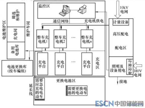 具有電池更換功能的充電站應(yīng)包括備用電池更換、電池存儲(chǔ)的設(shè)施及場(chǎng)所。充電站的基本功能應(yīng)包括配電、充電、監(jiān)控、計(jì)量和通信,擴(kuò)展功能為計(jì)費(fèi)。