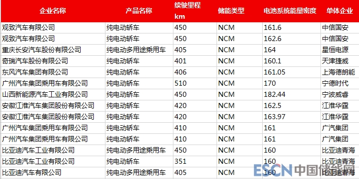 本次目錄中,共有14款新能源乘用車(chē)能量密度在160Wh/Kg及以上,電池種類(lèi)均為三元電池,比亞迪、江淮華霆、廣汽集團(tuán)、中信國(guó)安等提供以上配套電池。其中,由山西新能源申報(bào)的一款帝豪牌純電動(dòng)轎車(chē)的電池系統(tǒng)能量密度高達(dá)182.44wh/kg,配套電池企業(yè)為寧波威睿,創(chuàng)造了當(dāng)前國(guó)產(chǎn)動(dòng)力電池能量密度的新高。