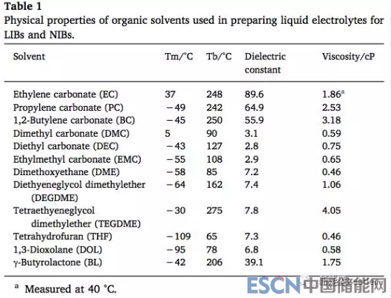 下表為常見的有機(jī)溶劑的物性參數(shù),從表中我們能夠注意到環(huán)狀溶劑,例如EC和PC具有較高的介電常數(shù),但是粘度也比較大,而線狀溶劑,例如DMC和DEC等介電常數(shù)比較低,但是粘度比較低,因此為了同時(shí)滿足較高的介電常數(shù)和較低的粘度的要求,在鋰離子電池中環(huán)形溶劑和線形溶劑通常會混合使用,Ponrouch等人的研究則進(jìn)一步顯示將碳酸脂類溶劑與醚類溶劑混合使用能夠獲得更好的電導(dǎo)率和更好的循環(huán)性能,因此通常Na離子電池的電解液也需要多種溶劑混合使用。