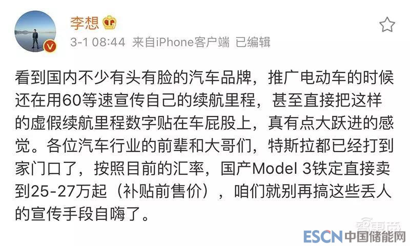 而李想的這個微博,也正是基于特斯拉標準續(xù)航版有感而發(fā)。