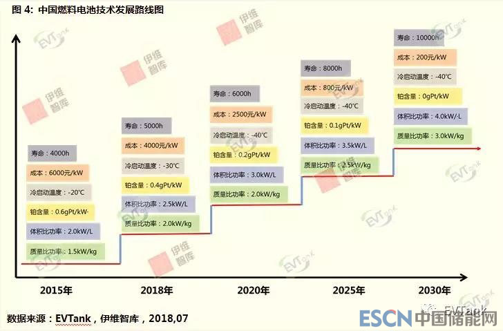 在技術(shù)發(fā)展路線圖方面,EVTank基于對(duì)行業(yè)技術(shù)專家的訪談和公開資料的整理,認(rèn)為中國的燃料電池目前在各種技術(shù)指標(biāo)方面均與國外存在明顯的差距,但是隨著中國燃料電池應(yīng)用市場(chǎng)的逐步成熟,有望帶動(dòng)燃料電池產(chǎn)業(yè)規(guī)模的快速擴(kuò)大,從而帶動(dòng)燃料電池技術(shù)的進(jìn)步。EVTank認(rèn)為到2025年,中國燃料電池的技術(shù)性能和成本指標(biāo)有望分別達(dá)到產(chǎn)業(yè)化發(fā)展的初期階段,而到2030年,中國燃料電池電堆的成本有望降低到200元/Kw,從而開始迎來燃料的大規(guī)模產(chǎn)業(yè)化發(fā)展的階段。