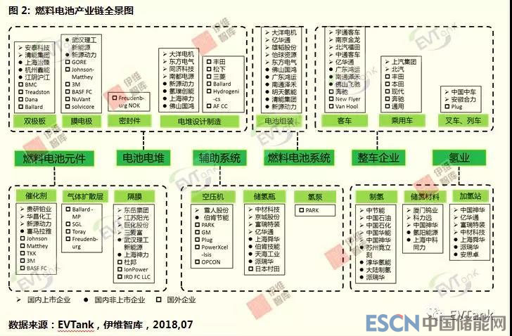 在《中國燃料電池產(chǎn)業(yè)發(fā)展白皮書(2018)》中,EVTank詳細(xì)梳理了燃料電池產(chǎn)業(yè)鏈全景圖,包括上游的燃料電池關(guān)鍵零部件,到燃料電池電堆及燃料電池系統(tǒng),最后到燃料電池的應(yīng)用領(lǐng)域及加氫站基礎(chǔ)設(shè)施建設(shè)等環(huán)節(jié)。EVTank分析認(rèn)為目前中國目前已經(jīng)基本形成了完善的燃料電池產(chǎn)業(yè)鏈,在燃料電池的關(guān)鍵環(huán)節(jié)如催化劑、雙極板、質(zhì)子交換膜等領(lǐng)域均已經(jīng)完成了小批量試制階段,即將迎來大規(guī)模量產(chǎn)。在燃料電池系統(tǒng)和應(yīng)用環(huán)節(jié),中國與國外的差距正在逐步縮小。
